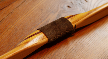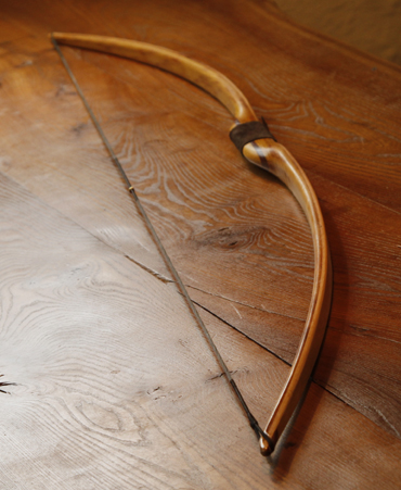Dette er en kort og spenstig bue laget av ett av verdens beste buematerialer: Osage orange. Den er forsterket på ryggen med en tynn stripe hickory og det er lagt inn mørkt tre i håndtaket som dekor. Buen er 170 cm. lang, og veier 45 pund ved 28 tommers trekk.